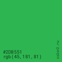Цвет #2DB551 в цветовой модели RGB обозначается тремя октетами (45, 181, 81) в десятичном формате и #2DB551 в шестнадцатиричном (hex) формате, которые являются интенсивностью красного 45 (hex 2D), интенсивность зелёного 181 (hex B5) и интенсивность синего 81 (hex 51).