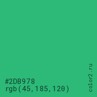 Цвет #2DB978 в цветовой модели RGB обозначается тремя октетами (45, 185, 120) в десятичном формате и #2DB978 в шестнадцатиричном (hex) формате, которые являются интенсивностью красного 45 (hex 2D), интенсивность зелёного 185 (hex B9) и интенсивность синего 120 (hex 78).