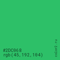 Цвет #2DC068 в цветовой модели RGB обозначается тремя октетами (45, 192, 104) в десятичном формате и #2DC068 в шестнадцатиричном (hex) формате, которые являются интенсивностью красного 45 (hex 2D), интенсивность зелёного 192 (hex C0) и интенсивность синего 104 (hex 68).