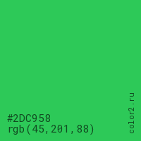 Цвет #2DC958 в цветовой модели RGB обозначается тремя октетами (45, 201, 88) в десятичном формате и #2DC958 в шестнадцатиричном (hex) формате, которые являются интенсивностью красного 45 (hex 2D), интенсивность зелёного 201 (hex C9) и интенсивность синего 88 (hex 58).