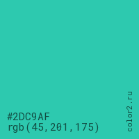 Цвет #2DC9AF в цветовой модели RGB обозначается тремя октетами (45, 201, 175) в десятичном формате и #2DC9AF в шестнадцатиричном (hex) формате, которые являются интенсивностью красного 45 (hex 2D), интенсивность зелёного 201 (hex C9) и интенсивность синего 175 (hex AF).