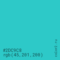 Цвет #2DC9C8 в цветовой модели RGB обозначается тремя октетами (45, 201, 200) в десятичном формате и #2DC9C8 в шестнадцатиричном (hex) формате, которые являются интенсивностью красного 45 (hex 2D), интенсивность зелёного 201 (hex C9) и интенсивность синего 200 (hex C8).