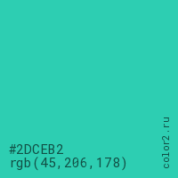 Цвет #2DCEB2 в цветовой модели RGB обозначается тремя октетами (45, 206, 178) в десятичном формате и #2DCEB2 в шестнадцатиричном (hex) формате, которые являются интенсивностью красного 45 (hex 2D), интенсивность зелёного 206 (hex CE) и интенсивность синего 178 (hex B2).