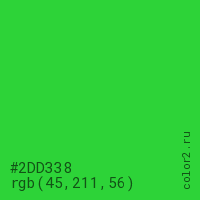 Цвет #2DD338 в цветовой модели RGB обозначается тремя октетами (45, 211, 56) в десятичном формате и #2DD338 в шестнадцатиричном (hex) формате, которые являются интенсивностью красного 45 (hex 2D), интенсивность зелёного 211 (hex D3) и интенсивность синего 56 (hex 38).
