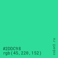 Цвет #2DDC98 в цветовой модели RGB обозначается тремя октетами (45, 220, 152) в десятичном формате и #2DDC98 в шестнадцатиричном (hex) формате, которые являются интенсивностью красного 45 (hex 2D), интенсивность зелёного 220 (hex DC) и интенсивность синего 152 (hex 98).
