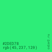 Цвет #2DED78 в цветовой модели RGB обозначается тремя октетами (45, 237, 120) в десятичном формате и #2DED78 в шестнадцатиричном (hex) формате, которые являются интенсивностью красного 45 (hex 2D), интенсивность зелёного 237 (hex ED) и интенсивность синего 120 (hex 78).