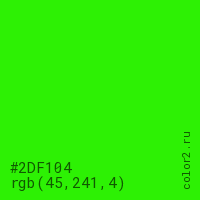 Цвет #2DF104 в цветовой модели RGB обозначается тремя октетами (45, 241, 4) в десятичном формате и #2DF104 в шестнадцатиричном (hex) формате, которые являются интенсивностью красного 45 (hex 2D), интенсивность зелёного 241 (hex F1) и интенсивность синего 4 (hex 04).