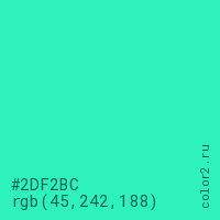 Цвет #2DF2BC в цветовой модели RGB обозначается тремя октетами (45, 242, 188) в десятичном формате и #2DF2BC в шестнадцатиричном (hex) формате, которые являются интенсивностью красного 45 (hex 2D), интенсивность зелёного 242 (hex F2) и интенсивность синего 188 (hex BC).