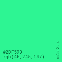 Цвет #2DF593 в цветовой модели RGB обозначается тремя октетами (45, 245, 147) в десятичном формате и #2DF593 в шестнадцатиричном (hex) формате, которые являются интенсивностью красного 45 (hex 2D), интенсивность зелёного 245 (hex F5) и интенсивность синего 147 (hex 93).