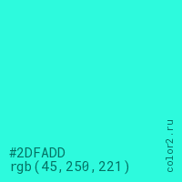 Цвет #2DFADD в цветовой модели RGB обозначается тремя октетами (45, 250, 221) в десятичном формате и #2DFADD в шестнадцатиричном (hex) формате, которые являются интенсивностью красного 45 (hex 2D), интенсивность зелёного 250 (hex FA) и интенсивность синего 221 (hex DD).