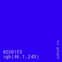 Цвет #2E01F3 в цветовой модели RGB обозначается тремя октетами (46, 1, 243) в десятичном формате и #2E01F3 в шестнадцатиричном (hex) формате, которые являются интенсивностью красного 46 (hex 2E), интенсивность зелёного 1 (hex 01) и интенсивность синего 243 (hex F3).