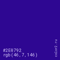 Цвет #2E0792 в цветовой модели RGB обозначается тремя октетами (46, 7, 146) в десятичном формате и #2E0792 в шестнадцатиричном (hex) формате, которые являются интенсивностью красного 46 (hex 2E), интенсивность зелёного 7 (hex 07) и интенсивность синего 146 (hex 92).