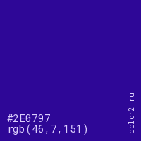 Цвет #2E0797 в цветовой модели RGB обозначается тремя октетами (46, 7, 151) в десятичном формате и #2E0797 в шестнадцатиричном (hex) формате, которые являются интенсивностью красного 46 (hex 2E), интенсивность зелёного 7 (hex 07) и интенсивность синего 151 (hex 97).