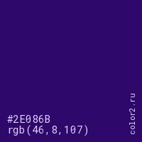 Цвет #2E086B в цветовой модели RGB обозначается тремя октетами (46, 8, 107) в десятичном формате и #2E086B в шестнадцатиричном (hex) формате, которые являются интенсивностью красного 46 (hex 2E), интенсивность зелёного 8 (hex 08) и интенсивность синего 107 (hex 6B).