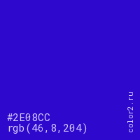 Цвет #2E08CC в цветовой модели RGB обозначается тремя октетами (46, 8, 204) в десятичном формате и #2E08CC в шестнадцатиричном (hex) формате, которые являются интенсивностью красного 46 (hex 2E), интенсивность зелёного 8 (hex 08) и интенсивность синего 204 (hex CC).