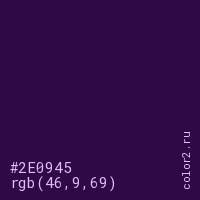 Цвет #2E0945 в цветовой модели RGB обозначается тремя октетами (46, 9, 69) в десятичном формате и #2E0945 в шестнадцатиричном (hex) формате, которые являются интенсивностью красного 46 (hex 2E), интенсивность зелёного 9 (hex 09) и интенсивность синего 69 (hex 45).