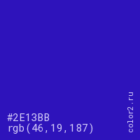Цвет #2E13BB в цветовой модели RGB обозначается тремя октетами (46, 19, 187) в десятичном формате и #2E13BB в шестнадцатиричном (hex) формате, которые являются интенсивностью красного 46 (hex 2E), интенсивность зелёного 19 (hex 13) и интенсивность синего 187 (hex BB).
