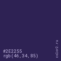 Цвет #2E2255 в цветовой модели RGB обозначается тремя октетами (46, 34, 85) в десятичном формате и #2E2255 в шестнадцатиричном (hex) формате, которые являются интенсивностью красного 46 (hex 2E), интенсивность зелёного 34 (hex 22) и интенсивность синего 85 (hex 55).