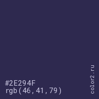 Цвет #2E294F в цветовой модели RGB обозначается тремя октетами (46, 41, 79) в десятичном формате и #2E294F в шестнадцатиричном (hex) формате, которые являются интенсивностью красного 46 (hex 2E), интенсивность зелёного 41 (hex 29) и интенсивность синего 79 (hex 4F).
