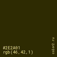 Цвет #2E2A01 в цветовой модели RGB обозначается тремя октетами (46, 42, 1) в десятичном формате и #2E2A01 в шестнадцатиричном (hex) формате, которые являются интенсивностью красного 46 (hex 2E), интенсивность зелёного 42 (hex 2A) и интенсивность синего 1 (hex 01).