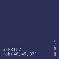 Цвет #2E3157 в цветовой модели RGB обозначается тремя октетами (46, 49, 87) в десятичном формате и #2E3157 в шестнадцатиричном (hex) формате, которые являются интенсивностью красного 46 (hex 2E), интенсивность зелёного 49 (hex 31) и интенсивность синего 87 (hex 57).