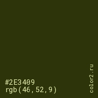 Цвет #2E3409 в цветовой модели RGB обозначается тремя октетами (46, 52, 9) в десятичном формате и #2E3409 в шестнадцатиричном (hex) формате, которые являются интенсивностью красного 46 (hex 2E), интенсивность зелёного 52 (hex 34) и интенсивность синего 9 (hex 09).