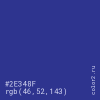 Цвет #2E348F в цветовой модели RGB обозначается тремя октетами (46, 52, 143) в десятичном формате и #2E348F в шестнадцатиричном (hex) формате, которые являются интенсивностью красного 46 (hex 2E), интенсивность зелёного 52 (hex 34) и интенсивность синего 143 (hex 8F).