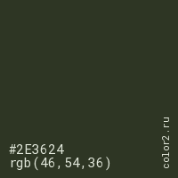 Цвет #2E3624 в цветовой модели RGB обозначается тремя октетами (46, 54, 36) в десятичном формате и #2E3624 в шестнадцатиричном (hex) формате, которые являются интенсивностью красного 46 (hex 2E), интенсивность зелёного 54 (hex 36) и интенсивность синего 36 (hex 24).