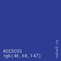Цвет #2E3C93 в цветовой модели RGB обозначается тремя октетами (46, 60, 147) в десятичном формате и #2E3C93 в шестнадцатиричном (hex) формате, которые являются интенсивностью красного 46 (hex 2E), интенсивность зелёного 60 (hex 3C) и интенсивность синего 147 (hex 93).