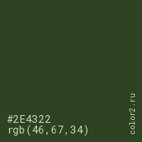 Цвет #2E4322 в цветовой модели RGB обозначается тремя октетами (46, 67, 34) в десятичном формате и #2E4322 в шестнадцатиричном (hex) формате, которые являются интенсивностью красного 46 (hex 2E), интенсивность зелёного 67 (hex 43) и интенсивность синего 34 (hex 22).