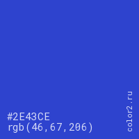 Цвет #2E43CE в цветовой модели RGB обозначается тремя октетами (46, 67, 206) в десятичном формате и #2E43CE в шестнадцатиричном (hex) формате, которые являются интенсивностью красного 46 (hex 2E), интенсивность зелёного 67 (hex 43) и интенсивность синего 206 (hex CE).