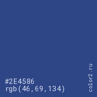 Цвет #2E4586 в цветовой модели RGB обозначается тремя октетами (46, 69, 134) в десятичном формате и #2E4586 в шестнадцатиричном (hex) формате, которые являются интенсивностью красного 46 (hex 2E), интенсивность зелёного 69 (hex 45) и интенсивность синего 134 (hex 86).
