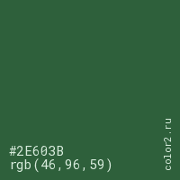 Цвет #2E603B в цветовой модели RGB обозначается тремя октетами (46, 96, 59) в десятичном формате и #2E603B в шестнадцатиричном (hex) формате, которые являются интенсивностью красного 46 (hex 2E), интенсивность зелёного 96 (hex 60) и интенсивность синего 59 (hex 3B).