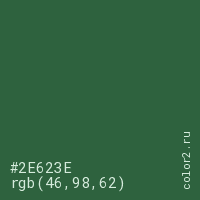 Цвет #2E623E в цветовой модели RGB обозначается тремя октетами (46, 98, 62) в десятичном формате и #2E623E в шестнадцатиричном (hex) формате, которые являются интенсивностью красного 46 (hex 2E), интенсивность зелёного 98 (hex 62) и интенсивность синего 62 (hex 3E).