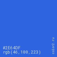 Цвет #2E64DF в цветовой модели RGB обозначается тремя октетами (46, 100, 223) в десятичном формате и #2E64DF в шестнадцатиричном (hex) формате, которые являются интенсивностью красного 46 (hex 2E), интенсивность зелёного 100 (hex 64) и интенсивность синего 223 (hex DF).