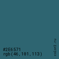 Цвет #2E6571 в цветовой модели RGB обозначается тремя октетами (46, 101, 113) в десятичном формате и #2E6571 в шестнадцатиричном (hex) формате, которые являются интенсивностью красного 46 (hex 2E), интенсивность зелёного 101 (hex 65) и интенсивность синего 113 (hex 71).