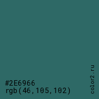 Цвет #2E6966 в цветовой модели RGB обозначается тремя октетами (46, 105, 102) в десятичном формате и #2E6966 в шестнадцатиричном (hex) формате, которые являются интенсивностью красного 46 (hex 2E), интенсивность зелёного 105 (hex 69) и интенсивность синего 102 (hex 66).