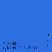 Цвет #2E70DF в цветовой модели RGB обозначается тремя октетами (46, 112, 223) в десятичном формате и #2E70DF в шестнадцатиричном (hex) формате, которые являются интенсивностью красного 46 (hex 2E), интенсивность зелёного 112 (hex 70) и интенсивность синего 223 (hex DF).