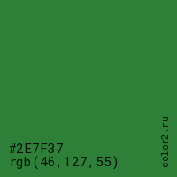 Цвет #2E7F37 в цветовой модели RGB обозначается тремя октетами (46, 127, 55) в десятичном формате и #2E7F37 в шестнадцатиричном (hex) формате, которые являются интенсивностью красного 46 (hex 2E), интенсивность зелёного 127 (hex 7F) и интенсивность синего 55 (hex 37).