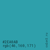 Цвет #2EA0AB в цветовой модели RGB обозначается тремя октетами (46, 160, 171) в десятичном формате и #2EA0AB в шестнадцатиричном (hex) формате, которые являются интенсивностью красного 46 (hex 2E), интенсивность зелёного 160 (hex A0) и интенсивность синего 171 (hex AB).