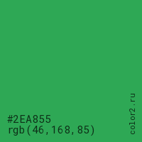Цвет #2EA855 в цветовой модели RGB обозначается тремя октетами (46, 168, 85) в десятичном формате и #2EA855 в шестнадцатиричном (hex) формате, которые являются интенсивностью красного 46 (hex 2E), интенсивность зелёного 168 (hex A8) и интенсивность синего 85 (hex 55).