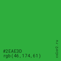 Цвет #2EAE3D в цветовой модели RGB обозначается тремя октетами (46, 174, 61) в десятичном формате и #2EAE3D в шестнадцатиричном (hex) формате, которые являются интенсивностью красного 46 (hex 2E), интенсивность зелёного 174 (hex AE) и интенсивность синего 61 (hex 3D).