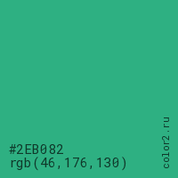 Цвет #2EB082 в цветовой модели RGB обозначается тремя октетами (46, 176, 130) в десятичном формате и #2EB082 в шестнадцатиричном (hex) формате, которые являются интенсивностью красного 46 (hex 2E), интенсивность зелёного 176 (hex B0) и интенсивность синего 130 (hex 82).