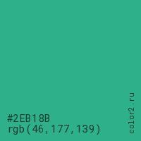 Цвет #2EB18B в цветовой модели RGB обозначается тремя октетами (46, 177, 139) в десятичном формате и #2EB18B в шестнадцатиричном (hex) формате, которые являются интенсивностью красного 46 (hex 2E), интенсивность зелёного 177 (hex B1) и интенсивность синего 139 (hex 8B).