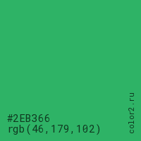 Цвет #2EB366 в цветовой модели RGB обозначается тремя октетами (46, 179, 102) в десятичном формате и #2EB366 в шестнадцатиричном (hex) формате, которые являются интенсивностью красного 46 (hex 2E), интенсивность зелёного 179 (hex B3) и интенсивность синего 102 (hex 66).