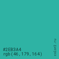 Цвет #2EB3A4 в цветовой модели RGB обозначается тремя октетами (46, 179, 164) в десятичном формате и #2EB3A4 в шестнадцатиричном (hex) формате, которые являются интенсивностью красного 46 (hex 2E), интенсивность зелёного 179 (hex B3) и интенсивность синего 164 (hex A4).