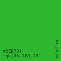 Цвет #2EB731 в цветовой модели RGB обозначается тремя октетами (46, 183, 49) в десятичном формате и #2EB731 в шестнадцатиричном (hex) формате, которые являются интенсивностью красного 46 (hex 2E), интенсивность зелёного 183 (hex B7) и интенсивность синего 49 (hex 31).
