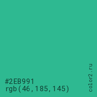 Цвет #2EB991 в цветовой модели RGB обозначается тремя октетами (46, 185, 145) в десятичном формате и #2EB991 в шестнадцатиричном (hex) формате, которые являются интенсивностью красного 46 (hex 2E), интенсивность зелёного 185 (hex B9) и интенсивность синего 145 (hex 91).