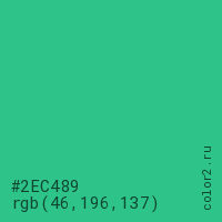 Цвет #2EC489 в цветовой модели RGB обозначается тремя октетами (46, 196, 137) в десятичном формате и #2EC489 в шестнадцатиричном (hex) формате, которые являются интенсивностью красного 46 (hex 2E), интенсивность зелёного 196 (hex C4) и интенсивность синего 137 (hex 89).