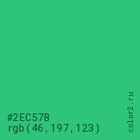 Цвет #2EC57B в цветовой модели RGB обозначается тремя октетами (46, 197, 123) в десятичном формате и #2EC57B в шестнадцатиричном (hex) формате, которые являются интенсивностью красного 46 (hex 2E), интенсивность зелёного 197 (hex C5) и интенсивность синего 123 (hex 7B).